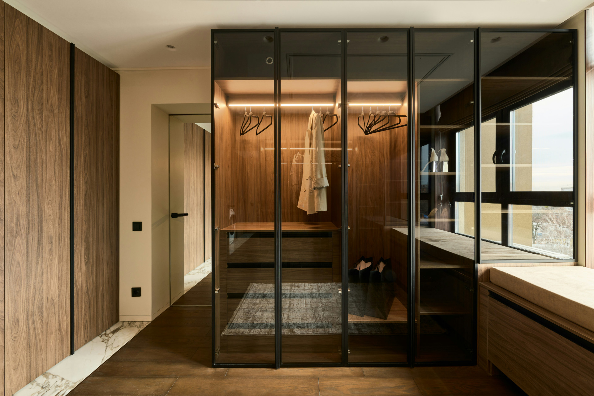 Garderoben är lämplig för större rum där det finns behov av en kombination av funktionalitet och en ren, modern look.