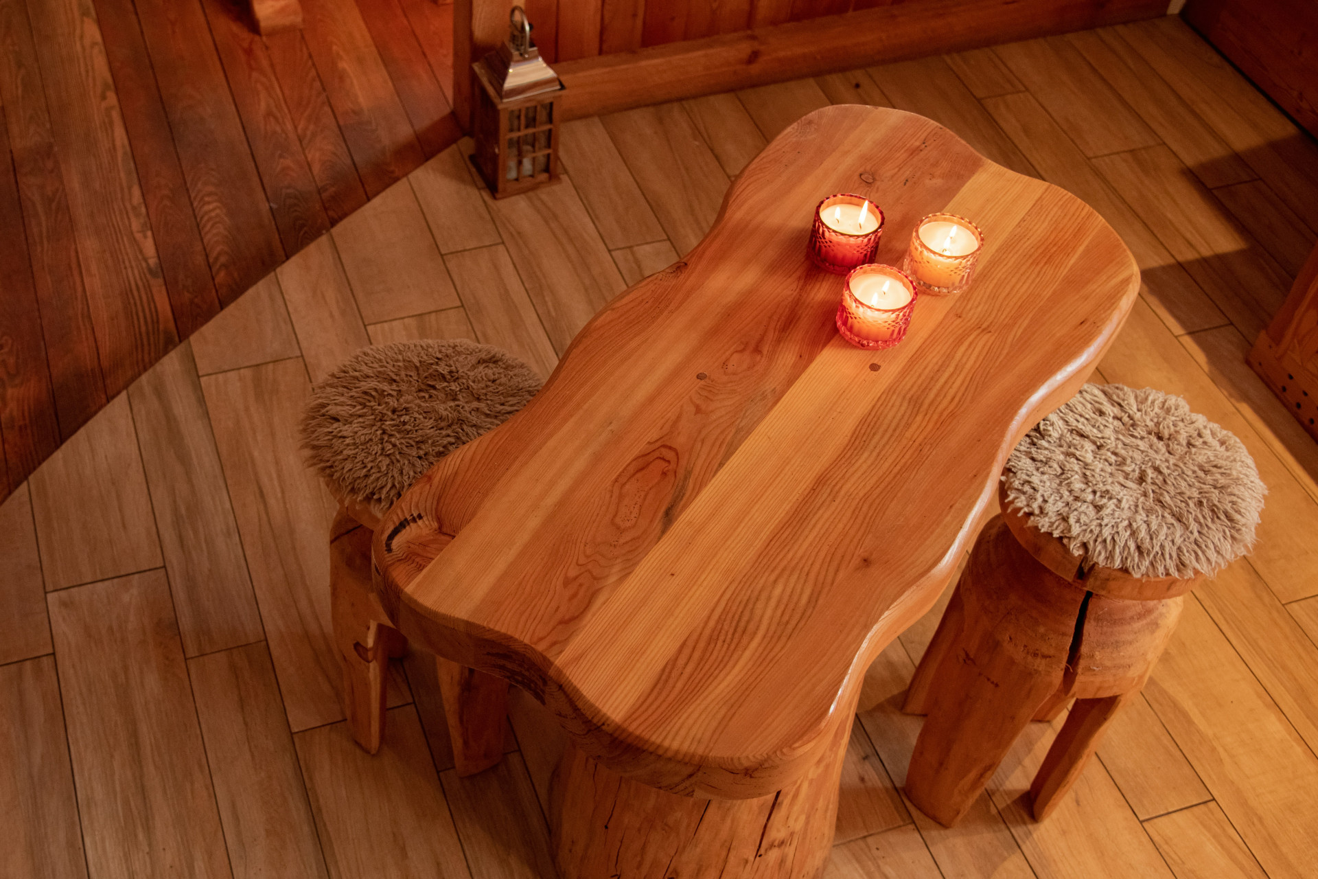 - Svartbetsad och oljad yta: Framhäver träets ådring och ger en varm ton.